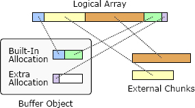 Figure 20.1: A Buffer object uses a collection of memory chunks to store what appears to be a linear array of bytes. Internal chunks are owned by the Buffer and freed when the Buffer is destroyed; external chunks are not owned by the Buffer.