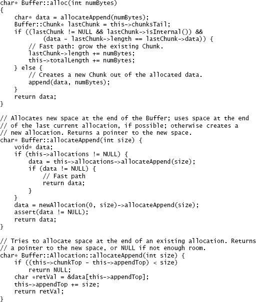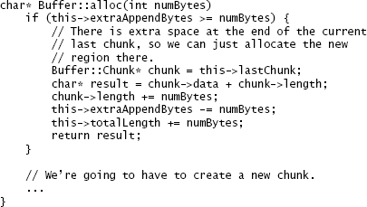 Figure 20.3 shows the new critical path for allocating internal space in a Buffer. The new code is not only faster, but it is also easier to read, since it avoids shallow abstractions. The entire path is handled in a single method, and it uses a single test to rule out all of the special cases. The new code introduces a new instance variable, extraAppendBytes, in order to simplify the critical path. This variable keeps track of how much unused space is available immediately after the last chunk in the Buffer. If there is no space available, or if the last chunk in the Buffer isn’t an internal chunk, or if the Buffer contains no chunks at all, then extraAppendBytes is zero. The code in Figure 20.3 represents the least possible amount of code to handle this common case.