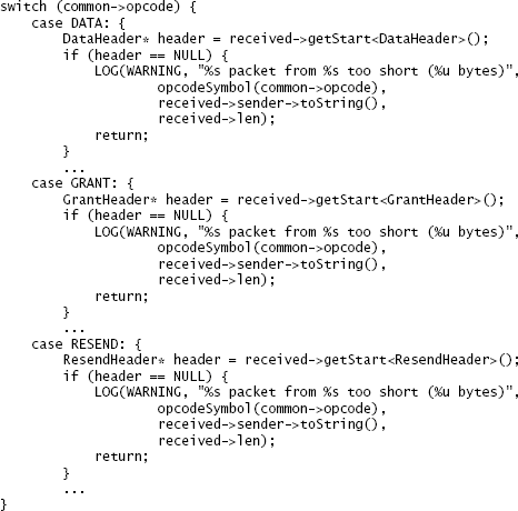 图 9.1:此代码处理不同类型的传入网络数据包。对于每种类型,如果数据包对于该类型而言太短,则会记录一条消息。在此版本的代码中,LOG 语句对于几种不同的数据包类型是重复的。